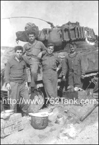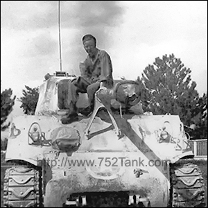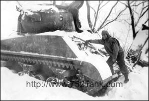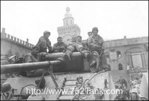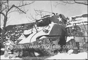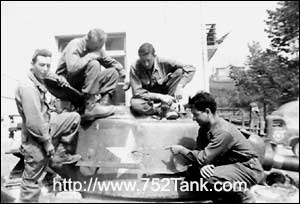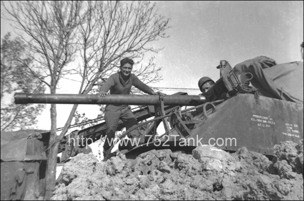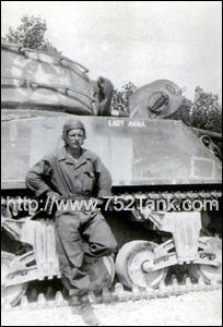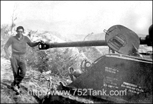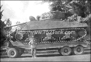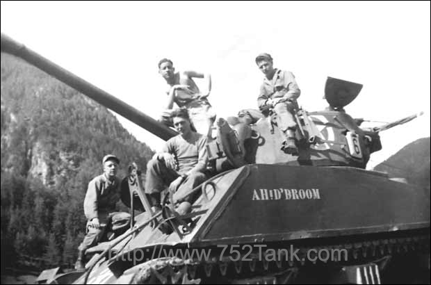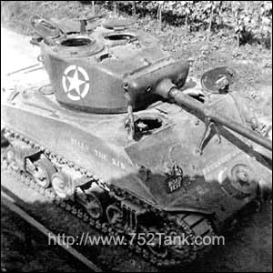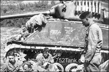 76mm Tanks in the Combat Period On 24 February 1945, the 752nd began exchanging the balance of its war-weary M4 and M4A1 tanks for 76mm M4A3 tanks. This process required the careful and methodical withdrawal of old tanks from static positions they had occupied for nearly 4 months. Many of the old tanks were literally frozen into position in the Northern Apennine mountains. The process was completed by 7 March 1945, and on that date the 752nd's "official" inventory consisted exclusively of M4A3 76mm VVSS tanks. However, in anticipation of the Spring Offensive, the 752nd retained several of its old M4 and M4A1 tanks as excess inventory. This was done to provide a fleet of older, more expendable tanks to be used as lead vehicles when crossing minefields in the push out of the mountains toward the Po Valley. A number of old M4/M4A1 tanks were in fact lost this way during the Spring Offensive, thus sparing the newer, more effective vehicles. All of the M4A3 tanks that the 752nd used in combat utilized the old VVSS suspension system. The battalion does not appear to have received any of the newer HVSS vehicles until well into the postwar period. The first photos of HVSS tanks in the 752nd appear in early November 1946. The 752nd's combat-era M4A3 76mm tanks varied considerably in terms of equipment and marking details. Photos show mainly T48 rubber track blocks in use, but some tanks were also equipped with T51 rubber track blocks. A few photos showing T54 steel track blocks have been found, and even T49 and the very rare T62 steel track blocks have been seen in photos of 752nd M4A3 tanks (see photos below). While many of the 752nd's M4A3s were fitted with the muzzle brake, it appears that nearly as many vehicles lacked it as had it. There was also a difference in the type of loader's hatches used. While the oval loader's hatch seems to have been far more common, several photos also show the round loader's hatch in use. All of the 752nd M4A3 76mm tanks had grouser racks welded onto both sides of the turret. While most combat vehicles in the battalion seem to have their racks filled with grousers, some vehicles in the same period had empty or near-empty racks, thus exposing the Allied star and providing a different look. The "luggage rack" field expedients that were welded onto the rear decks of some of the battalion's old M4's do not appear on any photos of the M4A3s. As with the old M4 and M4A1 tanks, the 752nd does not appear to have standardized its M4A3 vehicle markings until the postwar period. During the combat period, some tanks had no Allied stars on their turret, others had a "star in circle" on the turret, and others had a plain star on the turret's side. In most cases, these stars were obscured by the grouser rack if the grousers were in place. Those vehicles that used the "star in circle" on the turret also generally had a large "star in circle" on the transmission cover. Though high-angle photos are rare, some show a small plain star on the top surface of the turret, and others have no star on the turret top. No photos have surfaced yet of stars on the rear deck, likely because the 752nd relied heavily on the more effective air recognition panels during the later phases of the war. The large tactical numbers that had been used on the old M4s and M4A1s earlier in the war were not used on the M4A3 vehicles. Bumper codes still do not appear to be common or standardized on the battalion's 76mm M4A3s during the combat period. Nicknames were painted on the sides of only a few combat-era M4A3s, such as the upswept name "Betsy 2" on the side of Major Woodbury's tank, or the tank named "Lady Anna" (see photos below). The use of tank names seems to have become almost standard in the postwar period.