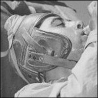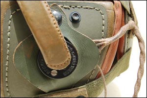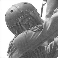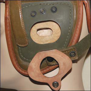 The M-1938 tank helmet was very light and comfortable to wear. The helmet in the above photos weighs less than 2 pounds when fully equipped with the exact communication gear and goggles shown above. The ten ¾-inch holes in the fiber crown provided adequate ventilation in most operating conditions. However, as discussed in the section of this web page titled "Use of Tape on Tankers' Helmets", the open ventilation holes were not always popular with the tankers. The M-1938 Tank Helmet was quite distinctive to the Armored Corps and was proudly worn by tank crewmen in all theaters of operation. Motorcycle-mounted MPs in WWII also commonly wore the tank helmet for crash protection. The M-1938 tank helmet continued to be issued through the late 1950's. Special Ventilation Feature The patent also allowed for a little-known ventilation feature. The leather retaining strap running transversely across the shell could be affixed to special snaps on the bottom of the ear flaps to keep the flaps in the upright position away from the wearer’s head. This feature was seldom if ever used by any tankers, and for very obvious reasons. The "flying nun" look was just too ridiculous for any self-respecting tanker. More practically speaking, the uplifted flaps would certainly snag on other equipment and interfere with entry and exit, and the lack of side support from the ear flaps made for a much less secure fit when configured this way. In addition, it took time to configure the helmet like this, and since it was not practical to wear the helmet like this inside the tank, a far better ventilation and comfort effect was achieved by simply removing the helmet from the head with one easy movement of the hand! Clever But Impractical Ventilation Feature