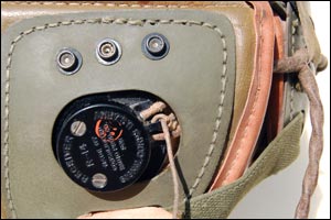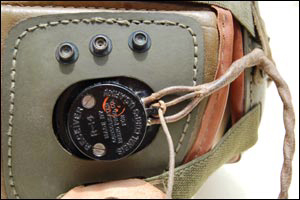 The most common way of routing the receiver headset harness was on the outside of the ear flap, and then under the leather receiver retainer. When routed in this fashion, the receiver harness tended to pull the R-14 receivers outward, which prevented them from sliding inward and moving out of their holding slots. "Over the Flap" Harness Routing Method