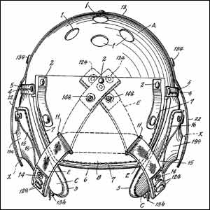 Note that ballistic protection was not part of the original design criteria, apparently because it was felt that this would slow the availability of a helmet that at least offered enhanced bump protection. As expected, the new Rawlings helmet resembled a football helmet in its design and construction. The outer crown and rear neck guard shells were constructed of a durable fiber resin, similar to the earlier tank helmets. The interior of the helmet featured a suspension system consisting of felt pads, leather pad retainers, and waxed cotton cords. This suspension system held the helmet in proper position on the wearer’s head and absorbed much of the shock when a bump was encountered. Drawings from Rawlings Patent Filed 1 May