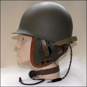 The most distinctive new feature of the M-1938 tanker helmet relative to the previous versions was the leather ear flap assembly. The ear flap extended well below the wearer’s ear and contained an ingenious flexible housing for retaining the ear phones in their proper position. The ear phones fit into a slot in the leather flap, and a thin leather fastening piece snapped over the ear phone to hold it in place. This leather fastening piece could be adjusted forward or backward via three metal snap fasteners to position the ear phone directly over the user’s ears. A curved leather-covered metal spring arm extended downward from the helmet’s fiber shell and exerted tension on the ear phone to hold the ear flap assembly snugly against the user’s ear. The spring arm was mounted on a swivel to allow it to be placed in a variety of positions, depending upon the user’s needs and accessory equipment. The ear flaps were also secured in place on the lower edges by an elasticized strap that connected through the rear fiber neck guard to fasteners at the bottom of each ear flap. The ear flaps fit snugly but comfortably, and without the use of chin straps, the helmet could be put on or taken off very easily. M-1938 tank helmets were introduced to the Armored Corps in 1941, even though the patent was not technically accepted until 12 May 1942. Manufacturing rights were granted to Rawlings Manufacturing Corporation, Sears Saddlery Company, Wilson Athletic Goods Manufacturing Company, and A.G. Spaulding & Brothers. Though essentially built to the same specifications, there were slight variations across the four manufacturers in terms of small details. Tank helmets were issued as part of a tank's onboard equipment, and were not issued to individual tankers. According to the 1942 War Department Technical Manual TM 9-731A, all M4 and M4A1 Sherman tanks came equipped with five helmets -- sizes 7, 7 1/8, 7 1/4, 7 3/8, and 7 1/2. The M5 Stuart Light Tank came equipped with four tank helmets for its four crew members, although the 1943 Technical Manual TM 9-732 does not specify the exact sizes that were supplied with each light tank. The following color photos better illustrate the design of the M-1938 Tank Helmet. Shown with this Sears Saddlery size 7 3/8 helmet are Polaroid 1021 goggles with green polarizing lens, a T-30-V throat microphone, and an HS-18 headset with high-impedence R-14 receivers. This setup is consistent with wartime photos of 752nd tankers, and especially typifies a 1944 tanker's helmet configuration. More information on the communication equipment and goggles can be found later on this web page. Tank Helmet M-1938 (Accessories Typical of
